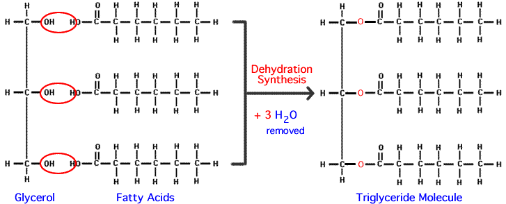 * TRIGLYCERIDES ARE FORMED BY CINDENSATION FROM THREE FATTY ACIDS AND ONE GLYCEROL.